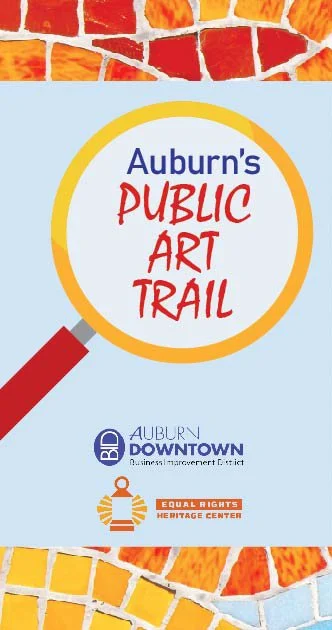 The Auburn Public Art Trail is a self-guided art walk through Downtown Auburn that highlights over a dozen public art pieces, including signature community mosaics, murals, and sculptures. Most of the artwork is highly visible and fully accessible to the public, and by pulling the individual pieces together into a walking trail we also want to put the spotlight on the stories behind the artwork and the artists who created them.