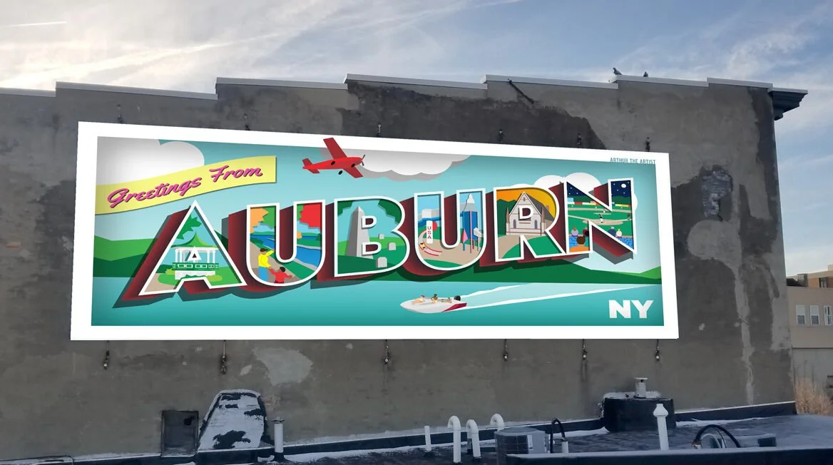 Patron: This Downtown Auburn BID mural was prepared with funding provided by the New York State Department of State funded by the Downtown Revitalization Initiative.