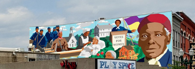 Harriet Tubman: Her Life in Freedom is the only mural dedicated to sharing Tubman’s incredible fight for human rights after finding freedom and settling in Auburn, NY. Located in the heart of the city that she called home for over 50 years, the design features scenes of Tubman at various stages of her life, as a leader of the 1863 Combahee River Raid, a nurse during the Civil War, an active participant in the women’s suffrage movement, and an older woman in the orchard she cultivated at her home.