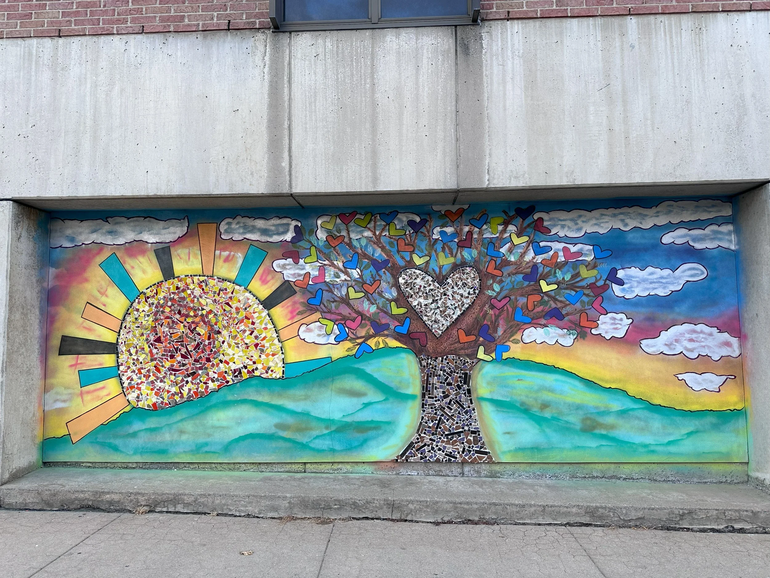 The design was inspired by both the wishes of the Boyle Center residents, and a black & white historic photograph depicting Genesee Street before the Boyle Center was built. Buildings include the B.P. Order of Elk’s Lodge and the beloved Big Store, and the iconic Auburn Memorial City Hall spire set in front of a colorful sunset background. The painted outline was done prior, to serve as a guide for the volunteers participating in the mosaic installation, and then reapplied after the grouting process was complete.