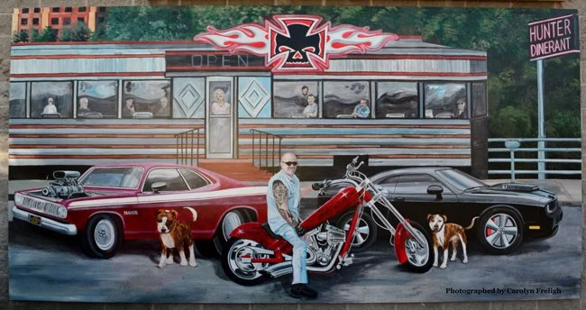 The mural scene depicts business & building owner Mike Antonacci on a motorcycle surrounded by his “toys” and furry friends with Hunter’s Dinerant in the background.