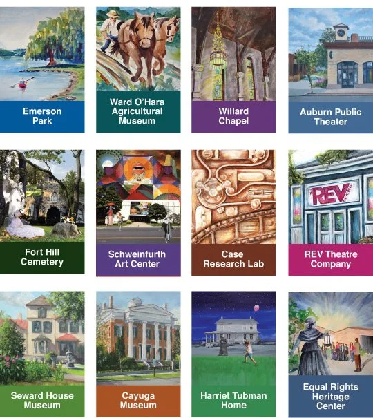 The 40 street light panels promote our city’s history, culture & recreational opportunities. The designs are lure pieces to educate and attract residents and visitors to explore our assets. Sites represented include Auburn Public Theater, Cayuga Museum & Case Research Lab, the Equal Rights Heritage Center, Fort Hill Cemetery, Harriet Tubman Home, Schweinfurth Art Center, Seward House Museum, Willard Chapel, Emerson Park, Ward O’Hara Ag Museum & The Rev Theatre Co.